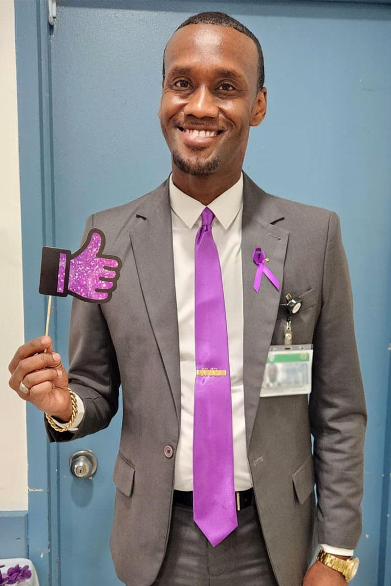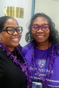 At Downstate, the spirit of purple shone during the Celebrating Survivors event, led by Nicole Sharpe, Benefits Associate and DV Agency Liaison; Cepeda Johnson, Assistant Vice President of Human Resources and DV Agency Liaison; and Magda Alliancin, Ed.D., CEAP, EAP Manager and Wellness Ambassador. The gathering featured educational resources, campaign highlights, and interactive activities, including a photo booth, raffle, and backpack-packing session for the Urban Resource Institute (URI) shelter.