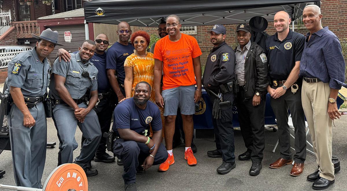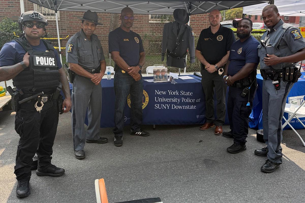 Many thanks to the Police Benevolent Association of New York State for sharing great photos of our University Police Department (UPD) in action at Downstate’s recent Community Healthy Lifestyle Fair. The pictures capture our UPD team doing what they do best—keeping the community safe, engaged, and motivated to stay active. From strength demonstrations to simple movement tips, they showed that fitness is for everyone, and a little encouragement goes a long way.
