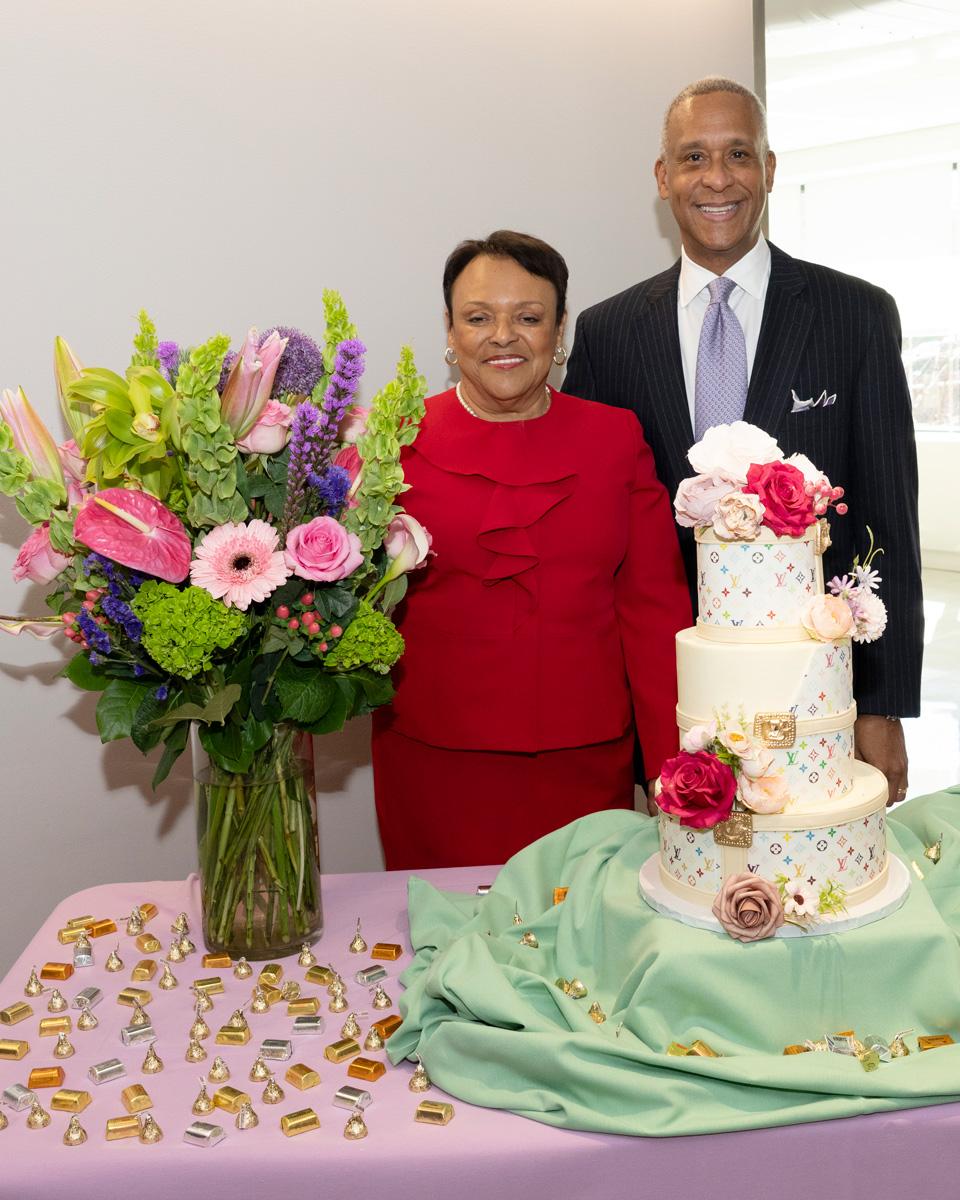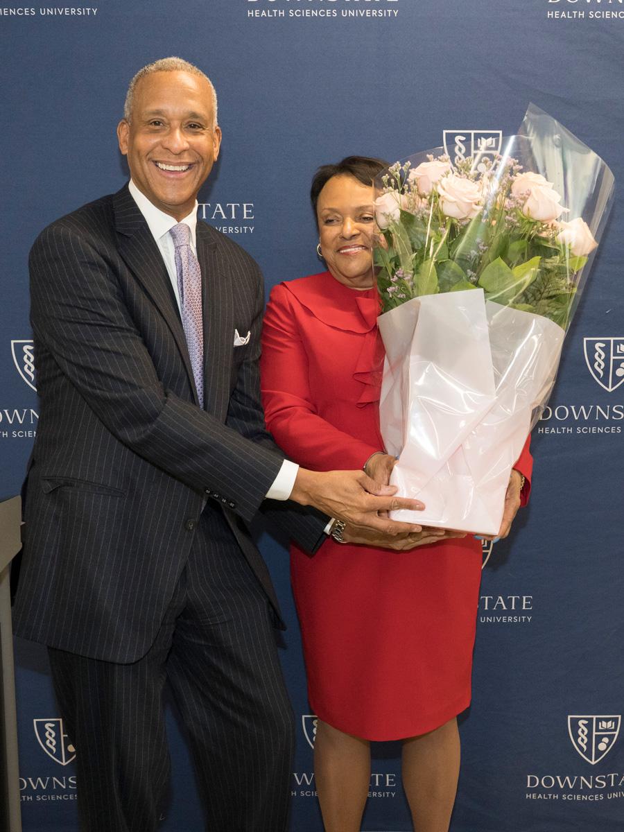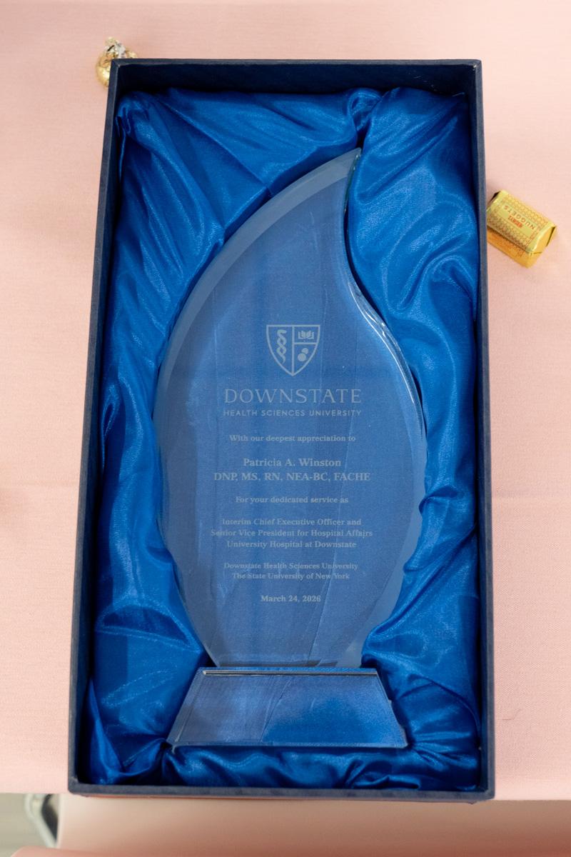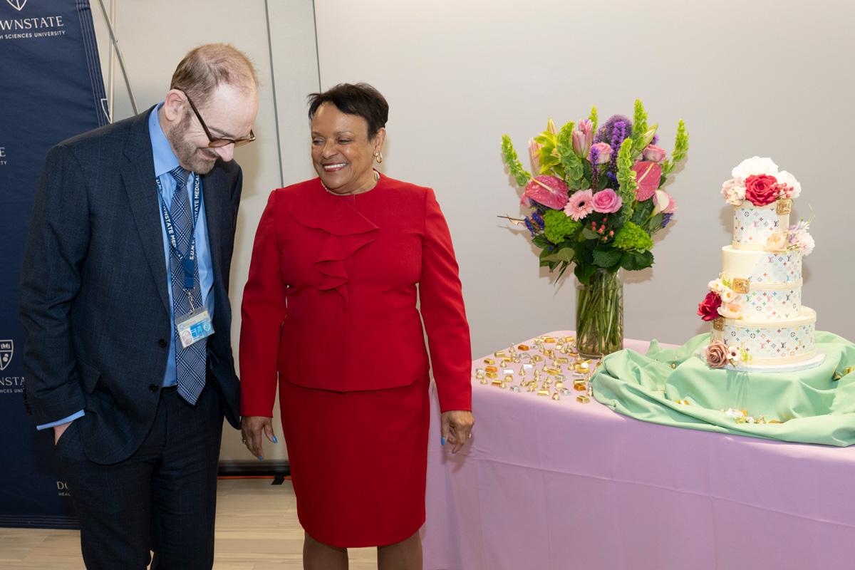 Colleagues presented Dr. Winston with flowers and tokens of recognition, including a crystal plaque thanking her for her service to Downstate, as well as a Louis Vuitton–themed cake offered as a lighthearted nod to her signature style.
