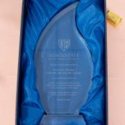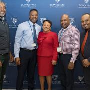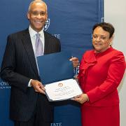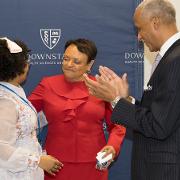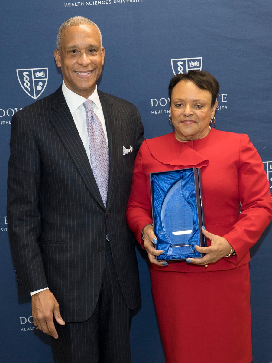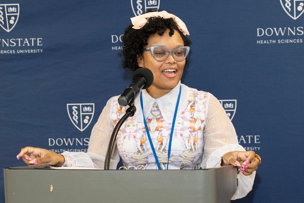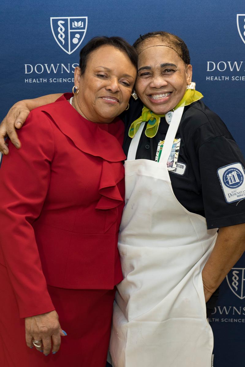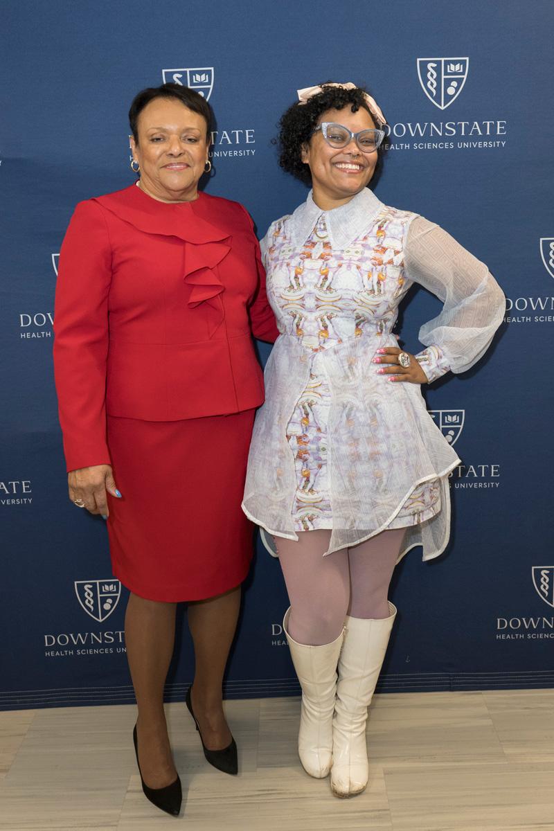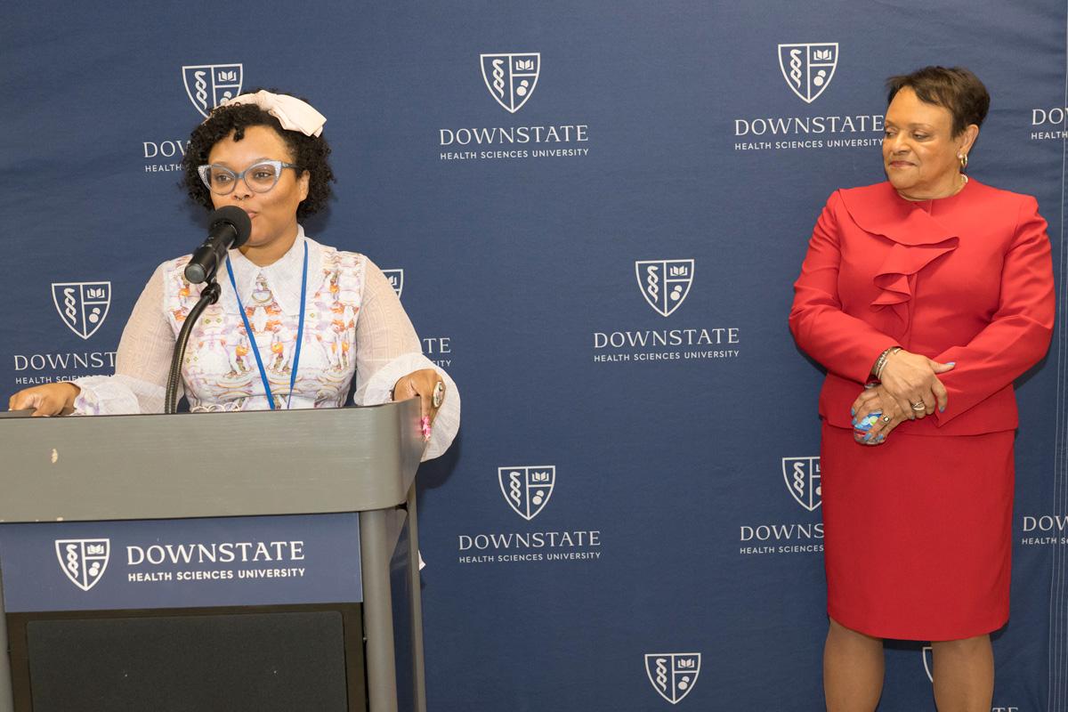 Colleagues presented Dr. Winston with flowers and tokens of recognition, including a crystal plaque thanking her for her service to Downstate, as well as a Louis Vuitton–themed cake offered as a lighthearted nod to her signature style.