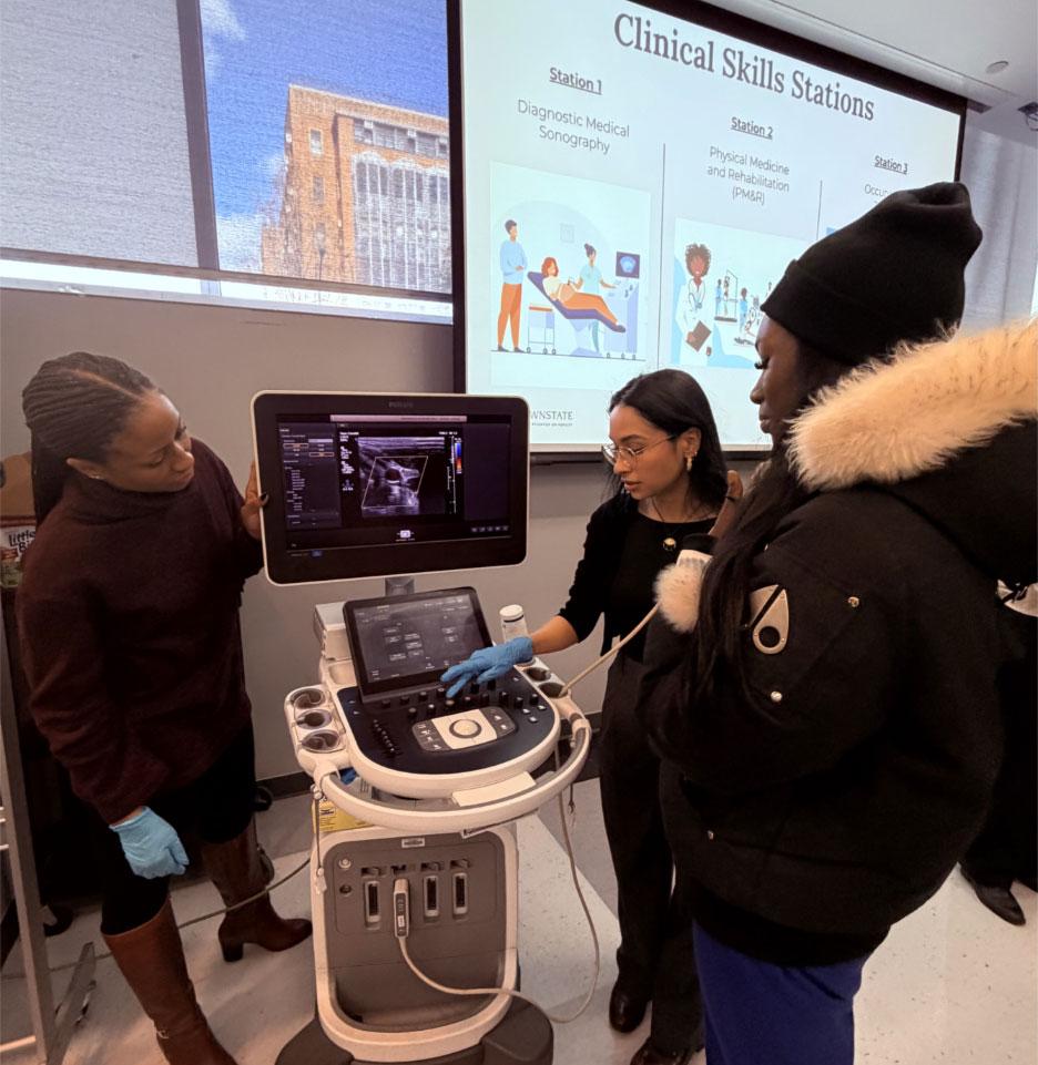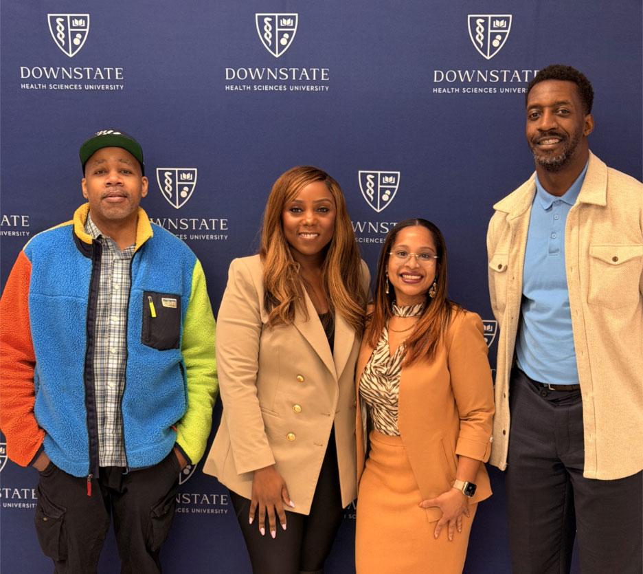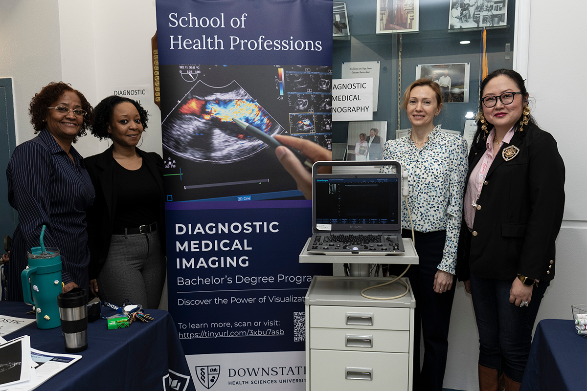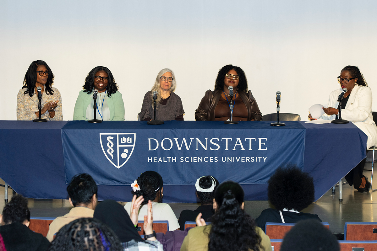 Faculty and students from the School of Health Professions led clinical stations in Occupational Therapy and Diagnostic Medical Sonography, with participation from the Physical Medicine & Rehabilitation Department. Adebanke Adebayo, M.D., Emergency Medicine Attending (Queens Hospital and former Downstate NICU/PICU Registered Nurse), Shawn Gibson, M.D., Emergency Medicine Resident (Downstate/Kings County), Isaiah Marshall-Thomas, MPH, Coordinator for Special Programs, Efekona Nuwere, EdD, MPH, OTR/L, Chair of Occupational Therapy, and W. Marcus Lambert, Ph.D., Associate Vice President for Research Strategy and Operations, joined the professional panel.
