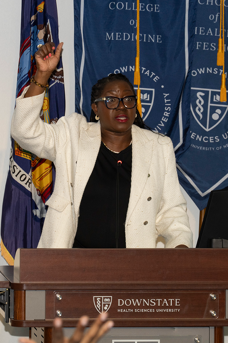 Vanessa Vales-Lewis, Ph.D., MAT, Assistant Dean, spoke about her career path and Downstate’s pipeline programs, reflecting on her experience in the Health Science Academy through the Arthur Ashe Institute for Urban Health and her current work mentoring students.