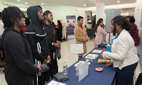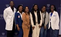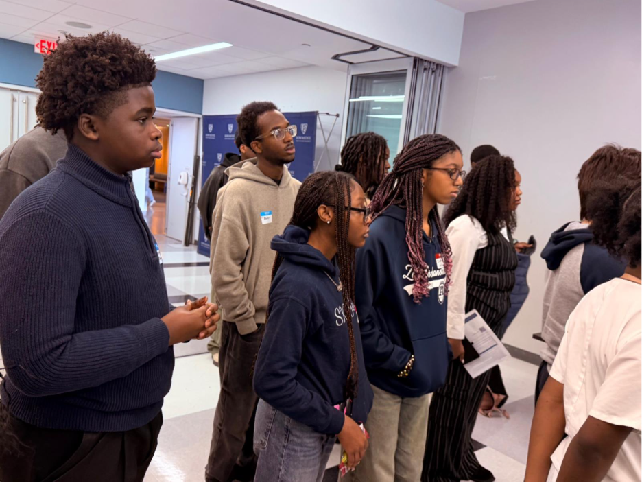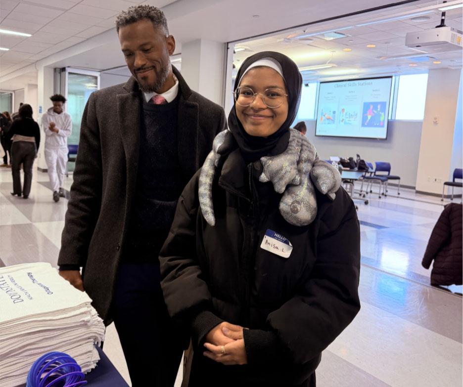 The Health Professions Career Day opened with a “Step Into the White Coat” photo experience, where students donned white coats alongside healthcare professionals, offering a direct introduction to clinical roles and the responsibilities associated with patient care. The program also included panels, mentorship networking, and hands-on clinical sessions introducing a range of healthcare careers.